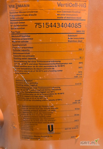 Przedmiotem sprzedaży jest zasobnik ciepłej wody Verti Cell marki Weissmann. Typ: 3003 212. Pojemność: 200l.