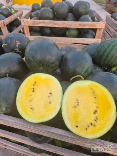 Sprzedam żółte arbuzy odmiany Janosik. Arbuz słodki i soczysty. Posiadam około 15 ton tej odmiany.