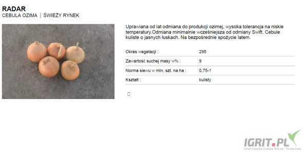 NASIONA CEBULI OZIMEJ.GEPWEG oferuje nasiona cebuli ozimej firmy SAKATA odmiany SHAKESPEARE F1(j.250 000n), SENSHYU YELLOW GLOBE F1(j.250 000n), firmy CORA SEEDS SKINER F1(j.250 000n),FOKKER F1,SENSHYU YELLOW,czerwone DIVINASTAR F1, CRX 3720 ,firmy HAZERA/ISI SEMENTI odmiany: SARATOGA F1(j. 0.5kg), SENSHUYU YELLOW (j. 0.5 kg), firmy BEJO odmiany:SWIFT F1, SIBIR F1, RADAR F1, OLYMPIC F1, BRIDGER F1, HIELO F1( biała łuska), RED SPRING F1(czerwona), firmy ENZA ZADEN odmiany: SONIC F1, BOREAS F1, GALATEA F1, TOUGH BALL F1, HI KEEPER F1(odmiany w promocji 4+1), SENSHUYU YELLOW F1(promocja 3+ 0.5).,firmy ARGENTA odmiany szczypiorowe: FRANKY F1, TONDA MUSONA F1.(j.250 000).Dostawa gratis. Płatność przy odbiorze, Zapraszamy do kontaktu.