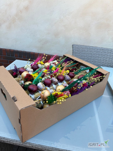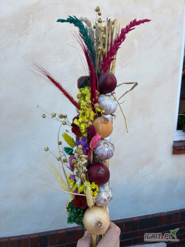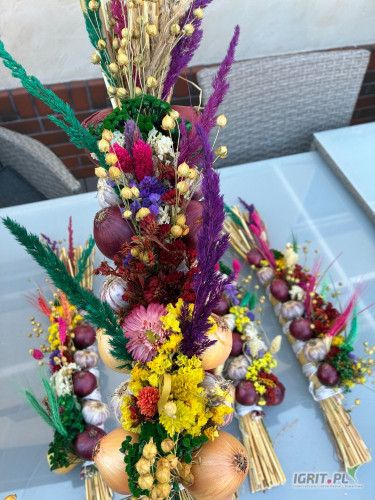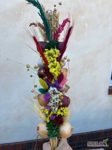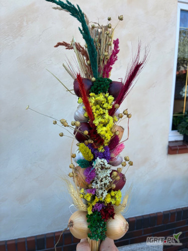 OpisSprzedam warkocze ozdobne wykonane z czosnku i cebuli udekorowane pięknymi suszonymi kłosami zbóż oraz kolorowymi kwiatami. Warkocze pakowane są w kartonach odbiór osobisty z domu po wcześniejszym ustaleniu.