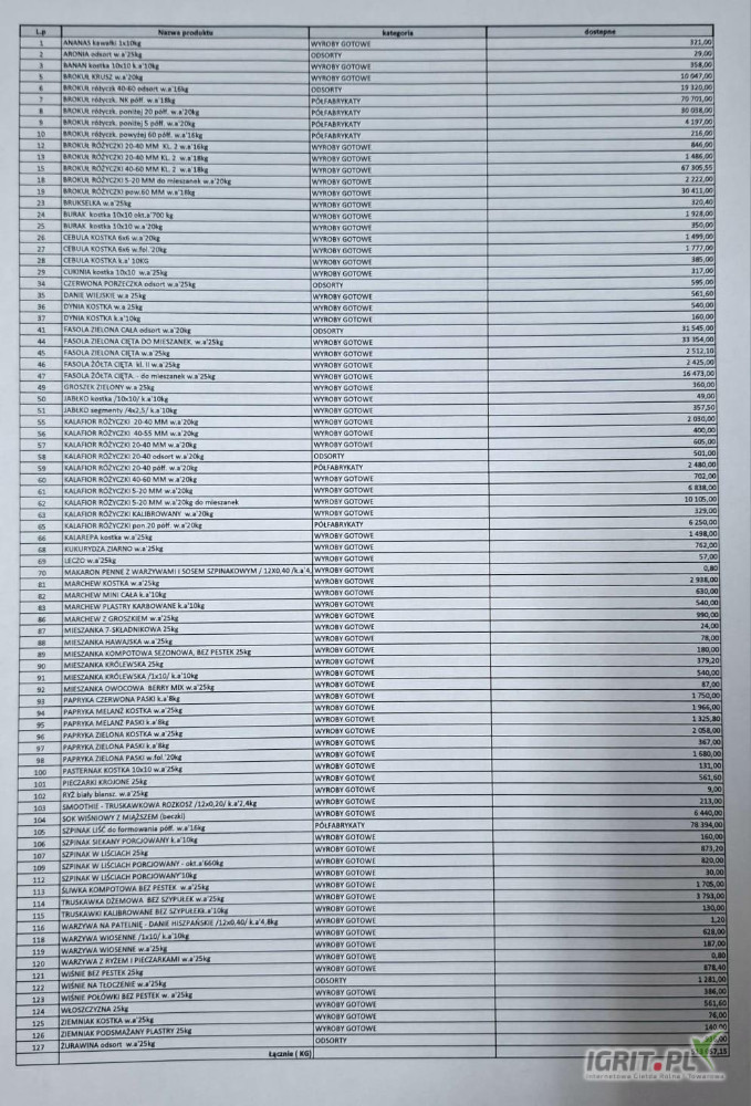 Informujemy, że w związku z postępowaniem upadłościowym Spółki BIMIZ FOOD, oferujemy możliwość zakupu owoców i warzyw mrożonych w atrakcyjnych cenach. W skład oferty wchodzą produkty różnych klas jakościowych – od klasy premium po klasy ekonomiczne. Cały towar pochodzi z produkcji BIMIZ FOOD, jest pełnowartościowy, odpowiednio przechowywany i gotowy do natychmiastowej sprzedaży. Zachęcamy do zapoznania się z ofertą i nawiązania współpracy. To doskonała okazja do zakupu produktów mrożonych w konkurencyjnych cenach przy zachowaniu wysokich standardów jakości. W załączeniu przesyłamy pełen wykaz dostępnych towarów. W razie zainteresowania prosimy o kontakt w celu uzyskania szczegółowych informacji dotyczących asortymentu, warunków dostawy i realizacji zamówienia.