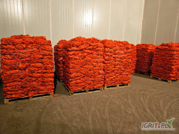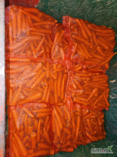 Sprzedam młodą mytą marchew z pod włókniny, odmiana Laguna. Kaliber: 25mm-40mm. Pakowana w worki szyte po 10kg. Ilości paletowe.