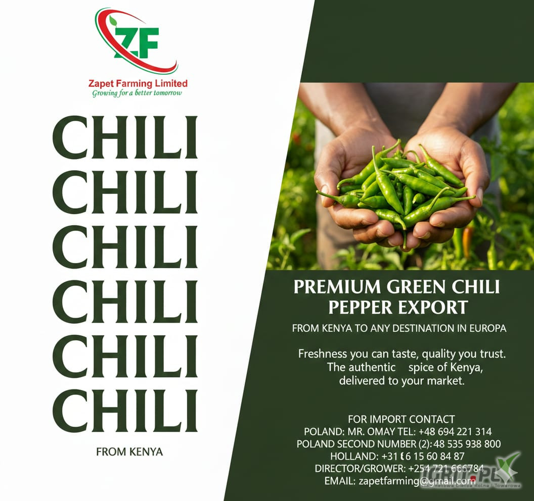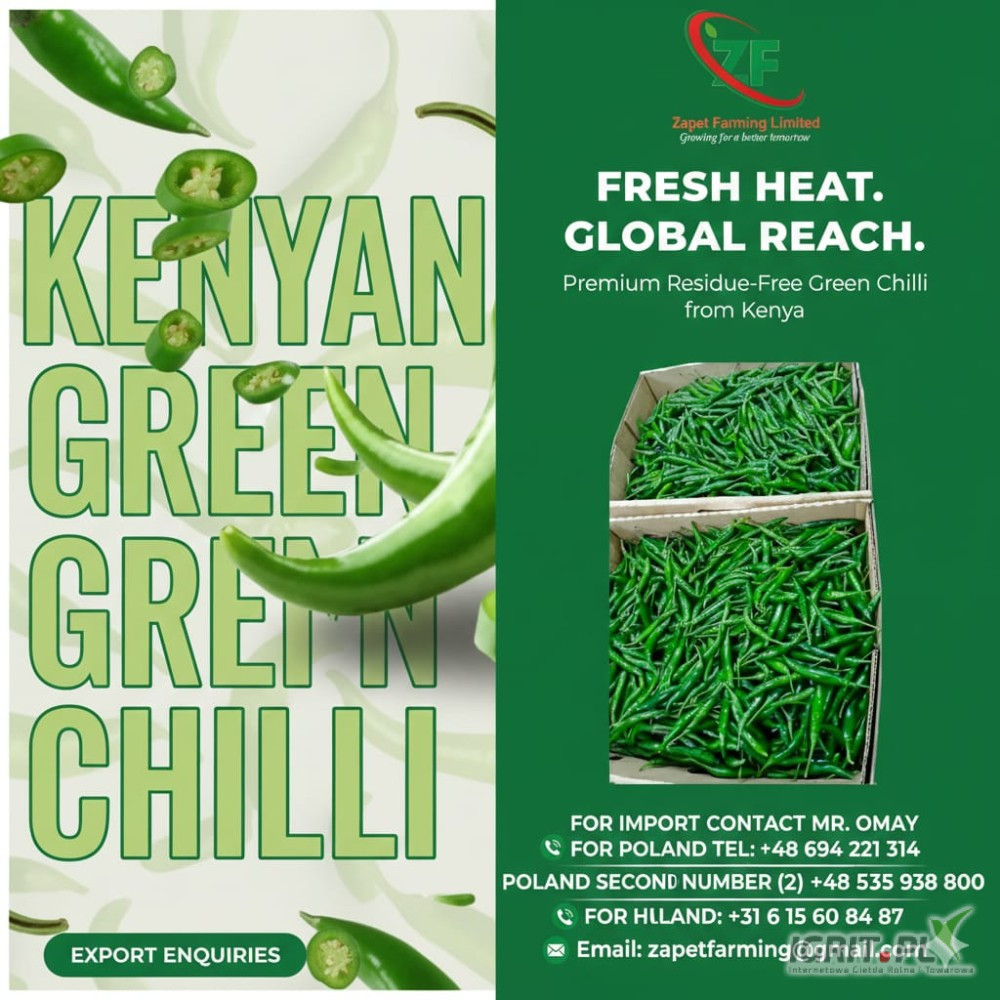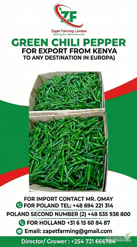 Zielone papryczki chili z Kenii. Cotygodniowe dostawy lotnicze do Katowic, Warszawy i Krakowa... Bezpośrednio od producenta. Zadzwoń, aby złożyć zamówienie i uzyskać wycenę: +48 694 221 314