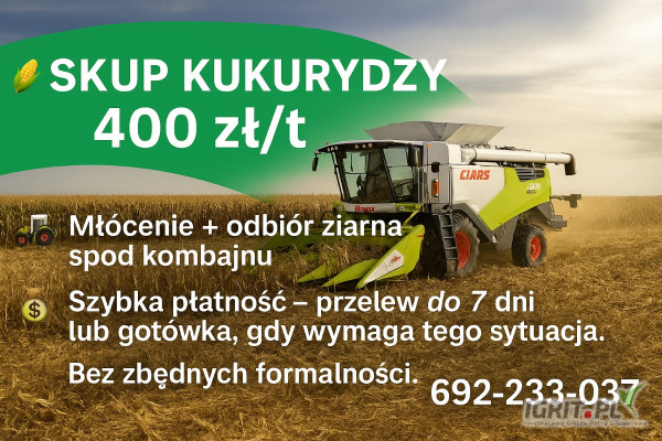 Skup mokrej kukurydzy. Prowadzimy skup mokrej kukurydzy, waga na miejscu, płatność 7 dni przelew/gotówka. Zapraszamy.
