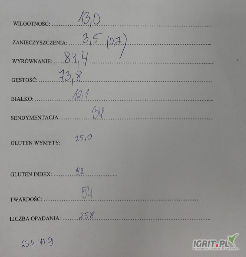Dzień dobry sprzedam pszenicę około 30 ton paszowej o parametrach które są w załączniku ceny jaką chce uzyskać to 770 zł netto możliwość dowozu do klienta za dopłatą.