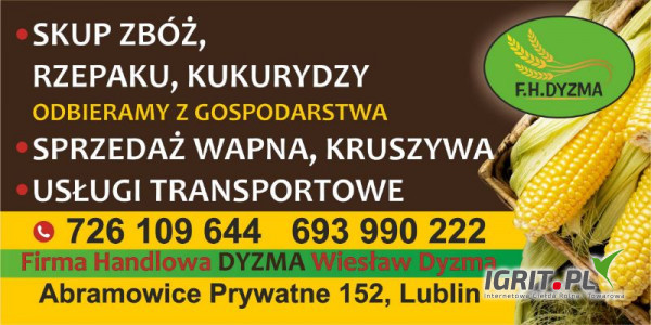 Firma Handlowa Dyzma zakupi całosamochodowe ilości pszenicy,jęczmienia,kukurydzy,rzepaku Odbieram własnym transportem. Szybka płatność. Zachęcam do kontaktu.