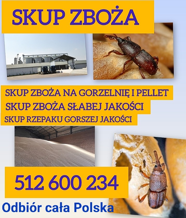 Kupię zboże słabej jakości na pellet i gorzelnię również paszowe i konsumpcyjne Szybka płatność i odbiór 512 600 234 Kupie rzepak gorszej jakości