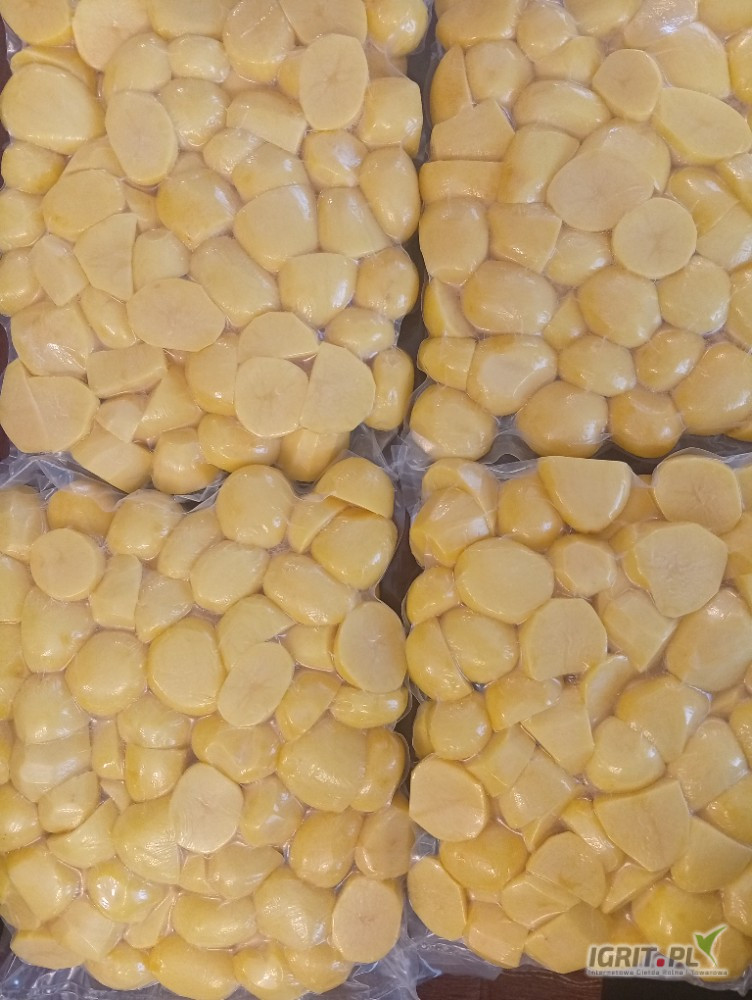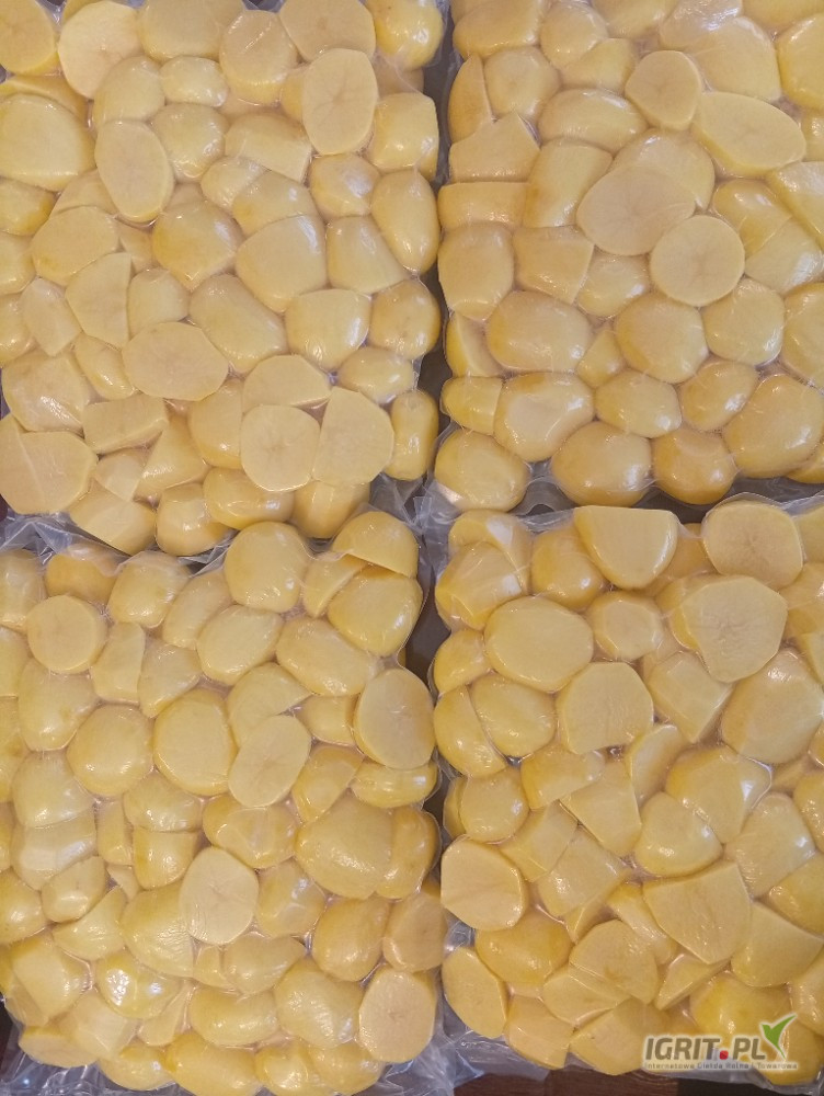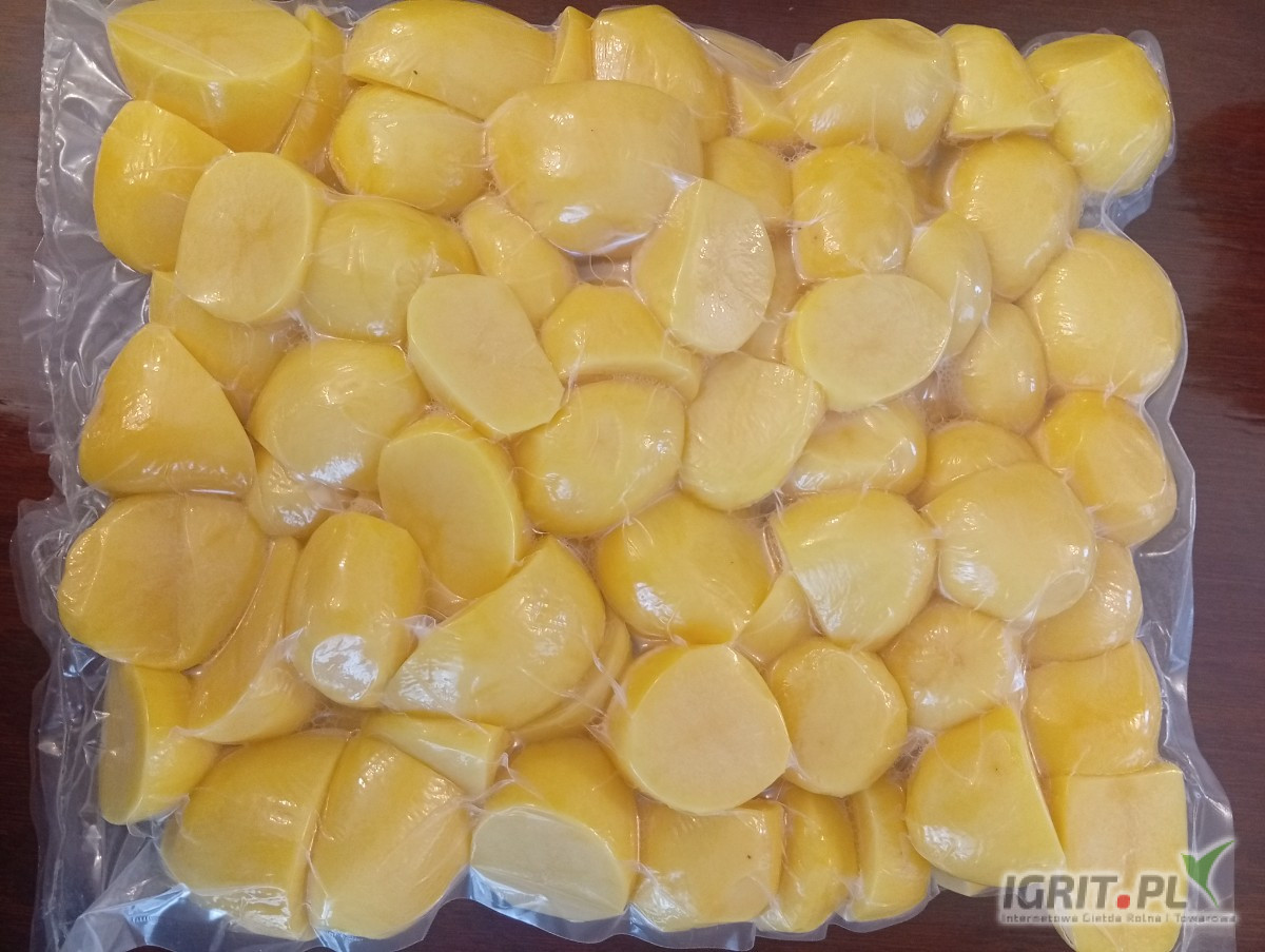 Obierane ziemniaki pakowane próżniowo vaccum w workach foliowych po 5 kilogramów, ziemniaki są pakowane dzień przed terminem zamówienia.