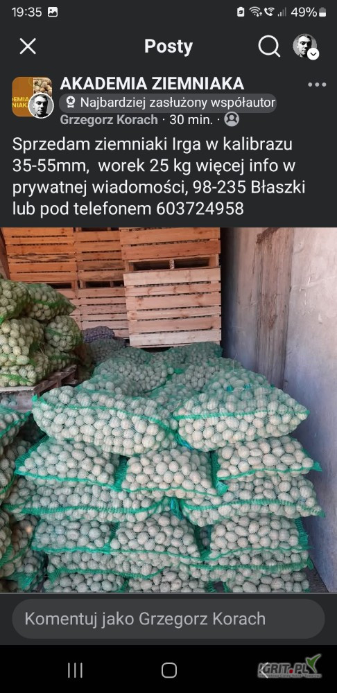 Sprzedam ziemniaki Irga w kalibrażu 35-50, worek 25 kg więcej pod numerem telefonu cena do negocjacji