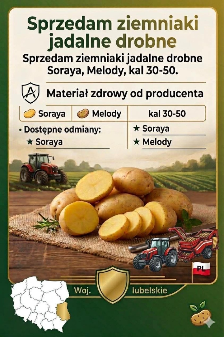 Sprzedam ziemniaki jadalne (drobne) kal 30-50 Odmiana Soraya,Melody opakowanie do uzgodnienia