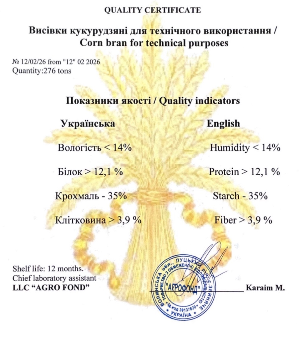 Otręby kukurydziane niegranulowane (Corn bran non granulated) FCA 80–600 Brody, Lwowski obwód Wilgotność ≤ 14% Białko ≥ 12,1% Błonnik ≥ 3,9% Pakowanie: luz / big-bagi Koszt : 115 /120 € WhatsApp/tel.: +380635281559