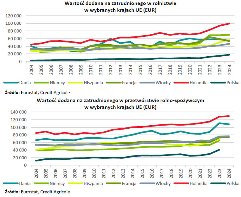 - Wsparcie dla takiej oceny stanowi relatywnie niska wartość dodana osiągana zarówno w rolnictwie, jak i w przetwórstwie rolno-spożywczym. W przypadku rolnictwa jest to rozwijanie bardziej zrównoważonego modelu produkcji uwzględniającego praktyki w obszarze rolnictwa regeneratywnego oraz poprawy dobrostanu zwierząt. Z kolei w przypadku przetwórstwa będą to działania zmierzające do awansu w ramach unijnych łańcuchów tworzenia wartości poprzez wyższy stopień przetworzenia produktów oraz innowacje - informują analitycy Credit Agricole. - Z tego powodu uważamy, że coraz mniejsze możliwości wykorzystywania przewag kosztowych polskiego sektora rolno-spożywczego nie muszą oznaczać pogorszenia perspektyw polskiego sektora-rolno spożywczego. Konieczna będzie jednak jego szybka adaptacja do zmieniających się warunków rynkowych.
