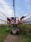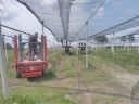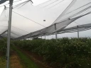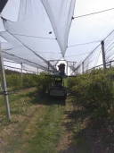 Posiadamy 4 platformy samojezdne, które pozwalają nam w ciągu 3 dni na rozwinięcie siatek na tak dużym obszarze. Siatki zamontowane są na gumach typu bungee, które w momencie opadu gradu rozciągają się, a nadmiar zsuwa się w międzyrzędzia. Gumy są amortyzatorami i pozwalają siatce na powrót na swoje miejsce po roztopieniu gradu. Siatki przeciwgradowe chronią borówki przed gradami, ale także świetnie sprawdzają się w ochronie przed szkodnikami jakimi są ptaki. Trwałość siatek jest szacowana na 25 lat, więc koszt inwestycji w tym czasie ulega rozłożeniu.