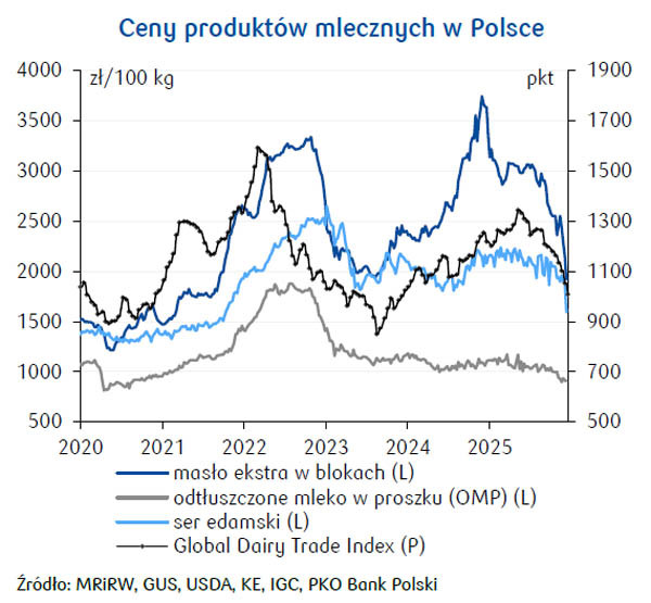 Czynnikiem wsparcia dla cen będą dobre perspektywy konsumpcji w UE. Eksport może znaleźć się pod presją polityki celnej Chin – wprowadzone w grudniu 2025 czasowe cła na import prod. mlecznych z UE (22-43%).