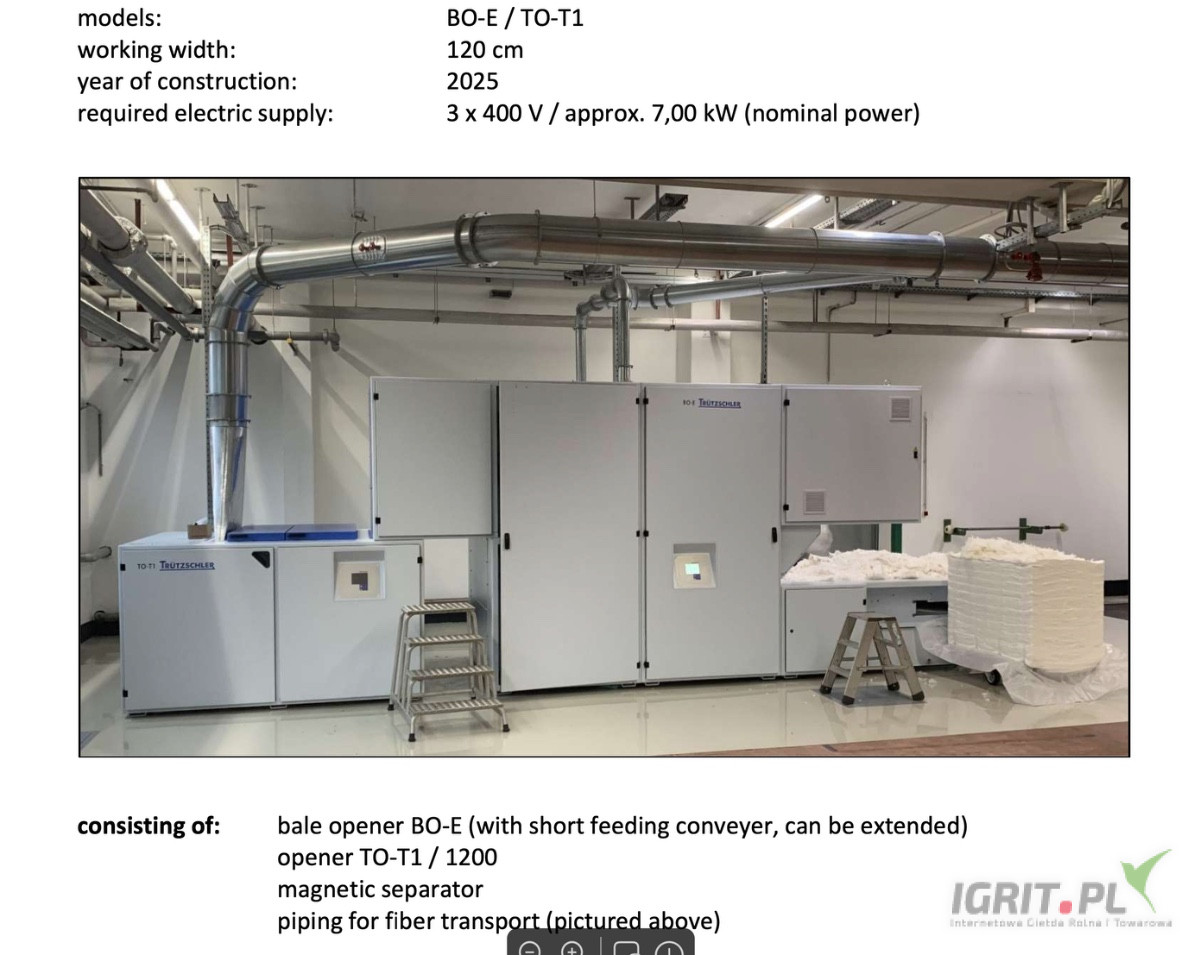 Trützschler bale opener (otwieracz bel) to zaawansowana maszyna z działu przygotowania przędzy (blow room) firmy Trützschler, służąca do automatycznego otwierania, rozluźniania i dozowania sprasowanych bel surowca (bawełny lub włókien sztucznych). Zapewnia równomierne podawanie materiału, wysoki stopień otwarcia włókien oraz precyzyjne mieszanie, co jest kluczowe dla jakości końcowej przędzy.