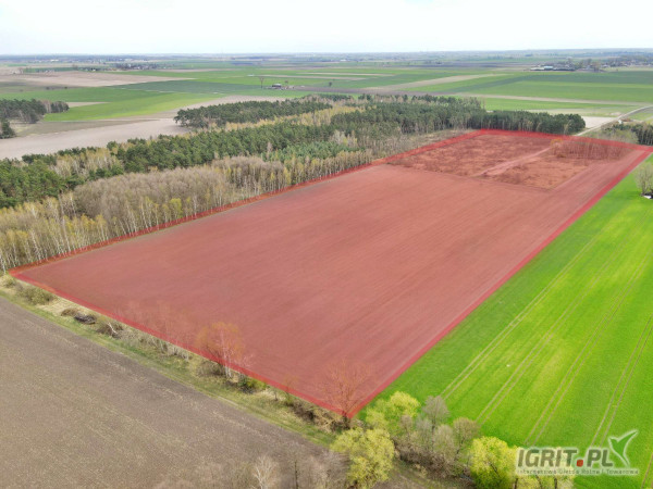 Działka w jednym kawałku, kształt prostokąta o wymiarach szerokość ok. 163 m, długość ok. 440 m.