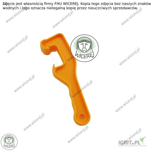 Otwieracz wykorzystuje się w celu bezpiecznego i szybkiego otwarcia pokryw pojemników pszczelarskich, odstojników na miód, wiader. Praktyczny, pomarańczowy klucz wykonany z wytrzymałego plastiku nada się nie tylko w pszczelarstwie, ale stworzony jest z myślą o bezpiecznym i wygodnym otwieraniu wszelkiego rodzaju pokryw beczek oraz plastikowych wiader. Klucz pozwala na szybkie otwieranie pojemników bez uszkodzenia pokryw i bez ryzyka skaleczenia palców lub złamania paznokci.