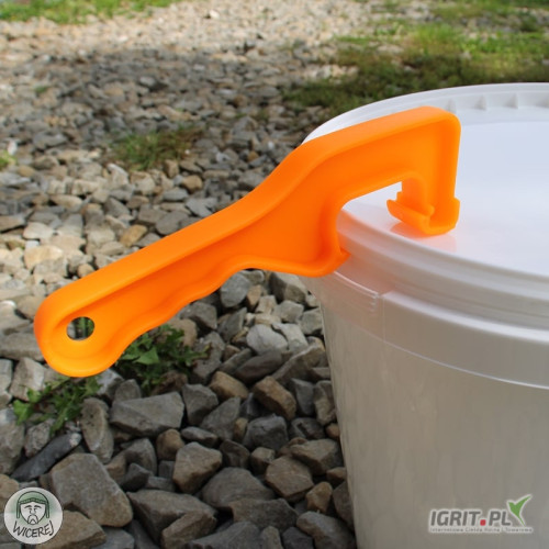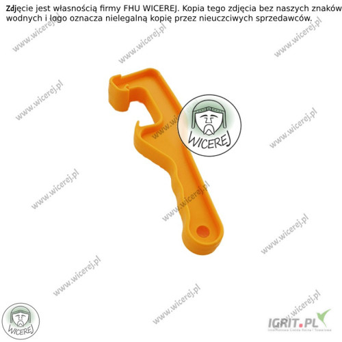 Uniwersalny klucz w widocznym pomarańczowym kolorze to niezastąpione narzędzie, które ułatwia codzienną pracę z zamykanymi pojemnikami, oszczędzając czas i zapewniając wygodę użytkowania.