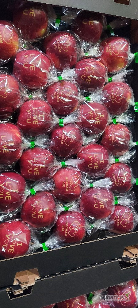 Każde jabłko zapakowane w woreczek celofanowy zaklejony tasiemką. Jabłka ułożone w kartonie na wytłoczce po 25 sztuk.