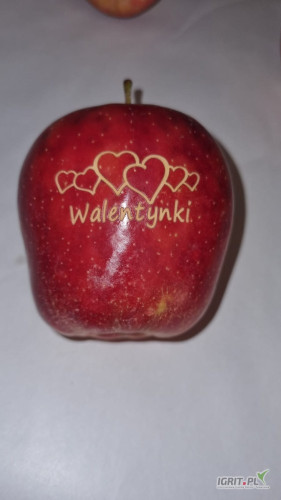 Sprzedam jabłka okolicznościowe grawerowane z walentynkowym motywem.