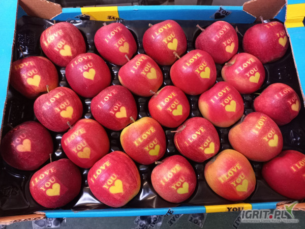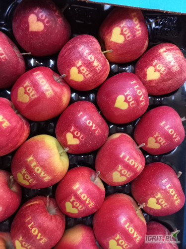 Sprzedam jabłko walentynkowe I LOVE You z serduszkiem klasa I. Naturalny napis nie grawer. Ładnie wybarwione.