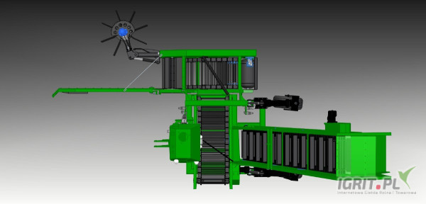 Urządzenie przeznaczone jest do zbioru jabłek leżących na ziemi. W maszynie są zastosowane taśmy, które podnoszą owoce i odseparowują liście i patyki.