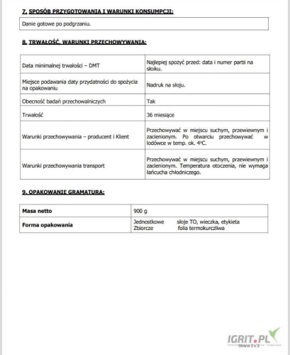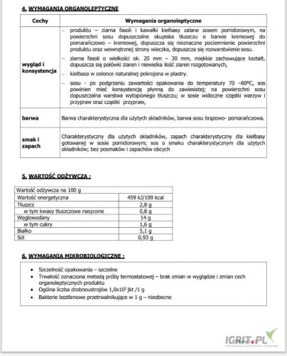 Fasolka w sosie pomidorowym z dodatkiem kiełbasy 900 ml produkt sporządzony ugotowany z ziaren fasoli z pokrojoną w plastry kiełbasa z dodatkiem przypraw aromatyczno smakowych zalany sosem pomidorowym utrwalony przez sterylizację w opakowaniach hermetyczny zamkniętych.